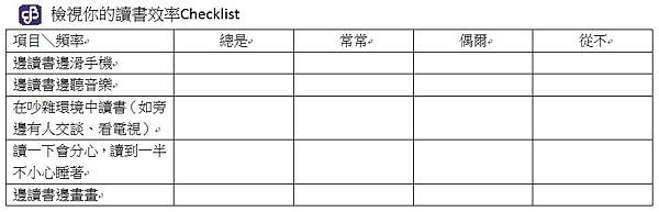3.如果讀書效率不好花了很多時間但無法完成預期進度或是完成了進度但並未吸收內容這樣成績還是沒辦法有明顯進步。請大家先完成下面的chccklist,如果您有2個選項以上勾選「常常」或「總是」,代表讀書效率可能不佳,需要減少發生唷。