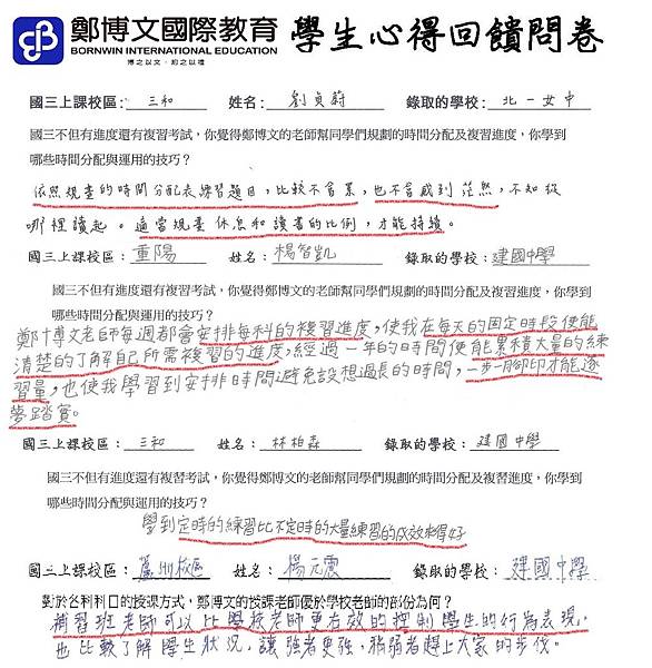 以下為鄭博文的前三志願學生對於在鄭博文有效率讀書的體驗心得: